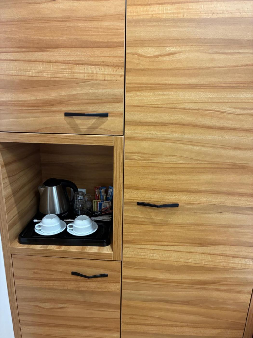 Wyposażenie obejmuje również lodówkę, minibar i czajnik.