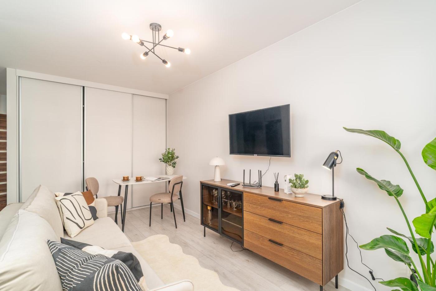 Apartament z 1 sypialnią. Featuring a private entrance, this air-conditioned apartment comprises a kitchen, 1 bedroom and 1 bathroom with a shower and a hairdryer. In the well-equipped kitchen, guests will find a stovetop, a refrigerator, a dishwasher and kitchenware. This apartment features a washing machine, flat-screen TV with streaming services, city views, as well as chocolate for guests. The unit offers 1 bed. Apartament - 2 osobowy. Powierzchnia pokoju ok.: 32 mkw.