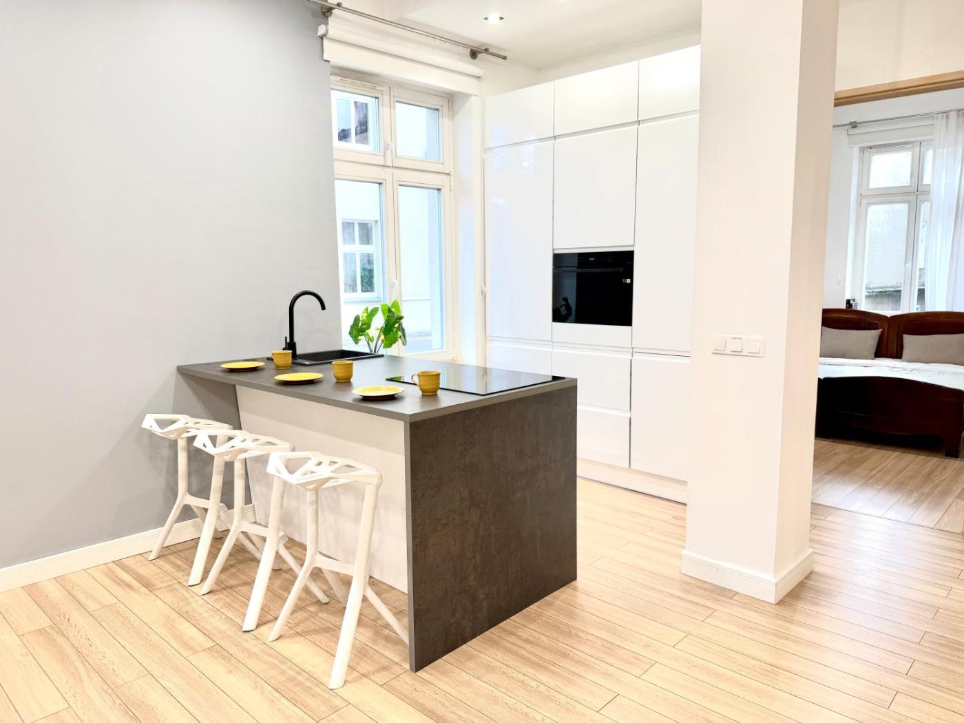 Apartament. This apartment consists of 1 living room, 2 separate bedrooms and 1 bathroom with a walk-in shower. Guests can make meals in the kitchen that is equipped with a stovetop, a refrigerator, a dishwasher and kitchenware. Among the room amenities are a washing machine, a tea and coffee maker and a wardrobe as well as a quiet street view. The unit offers 6 beds. Apartament - 7 osobowy. Powierzchnia pokoju ok.: 55 mkw.